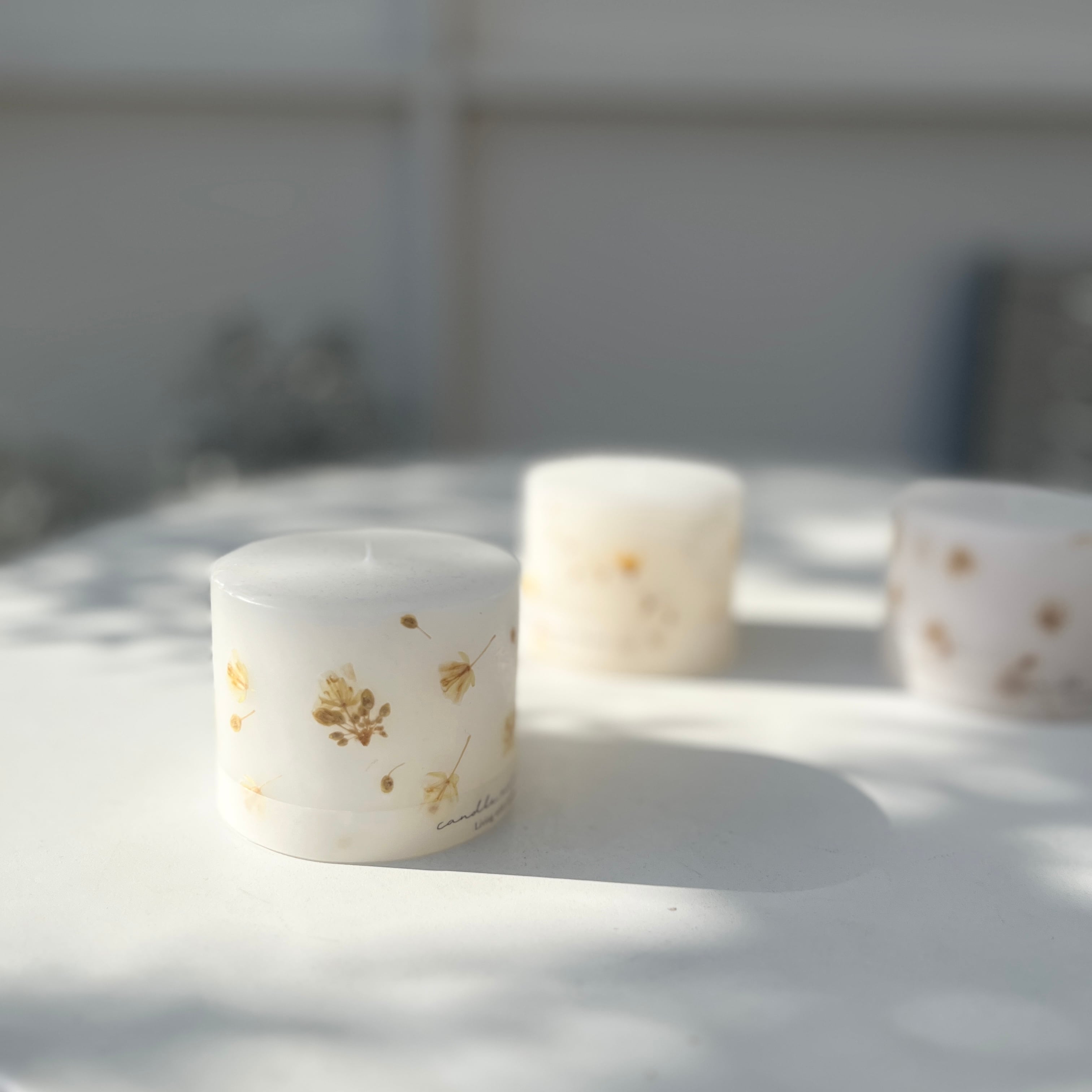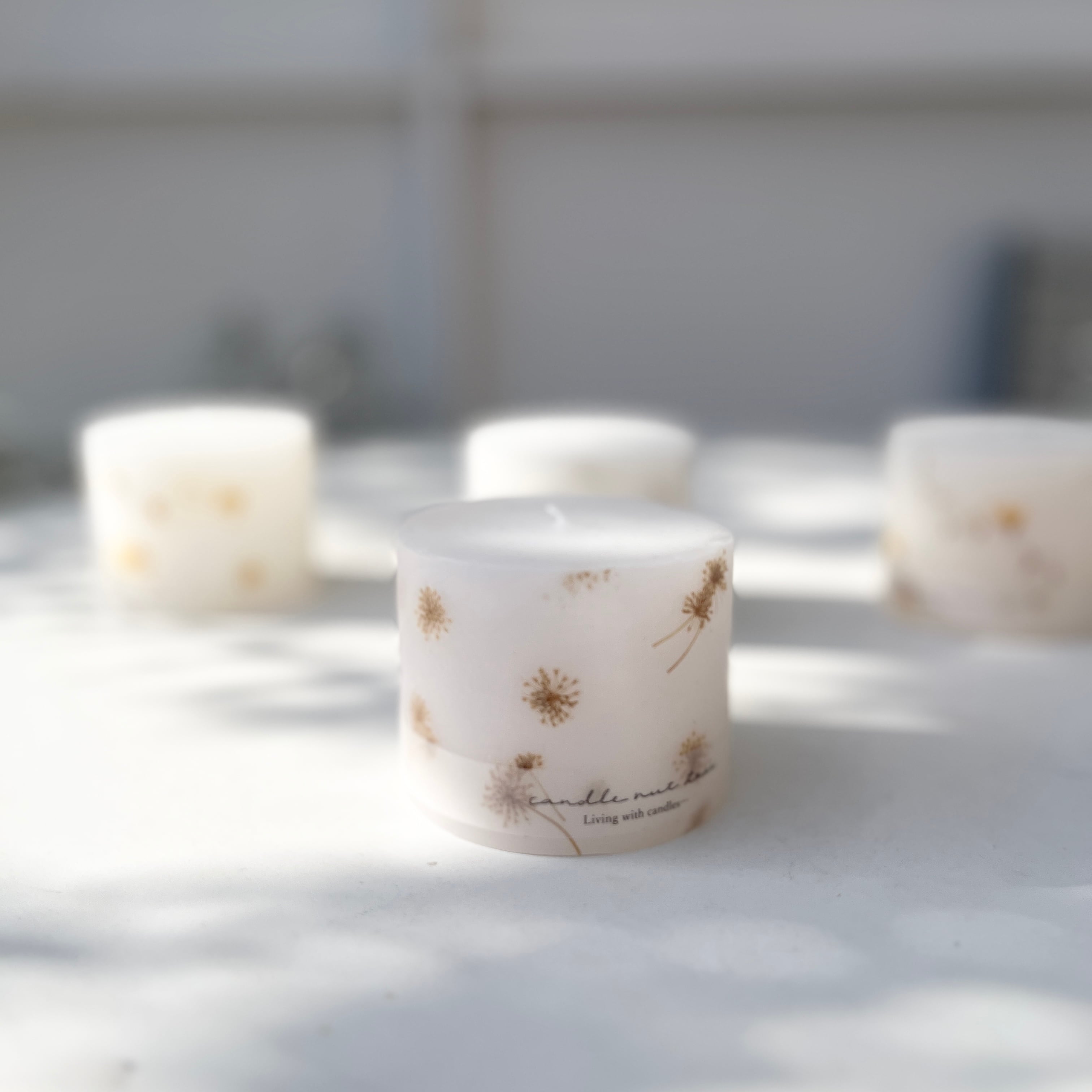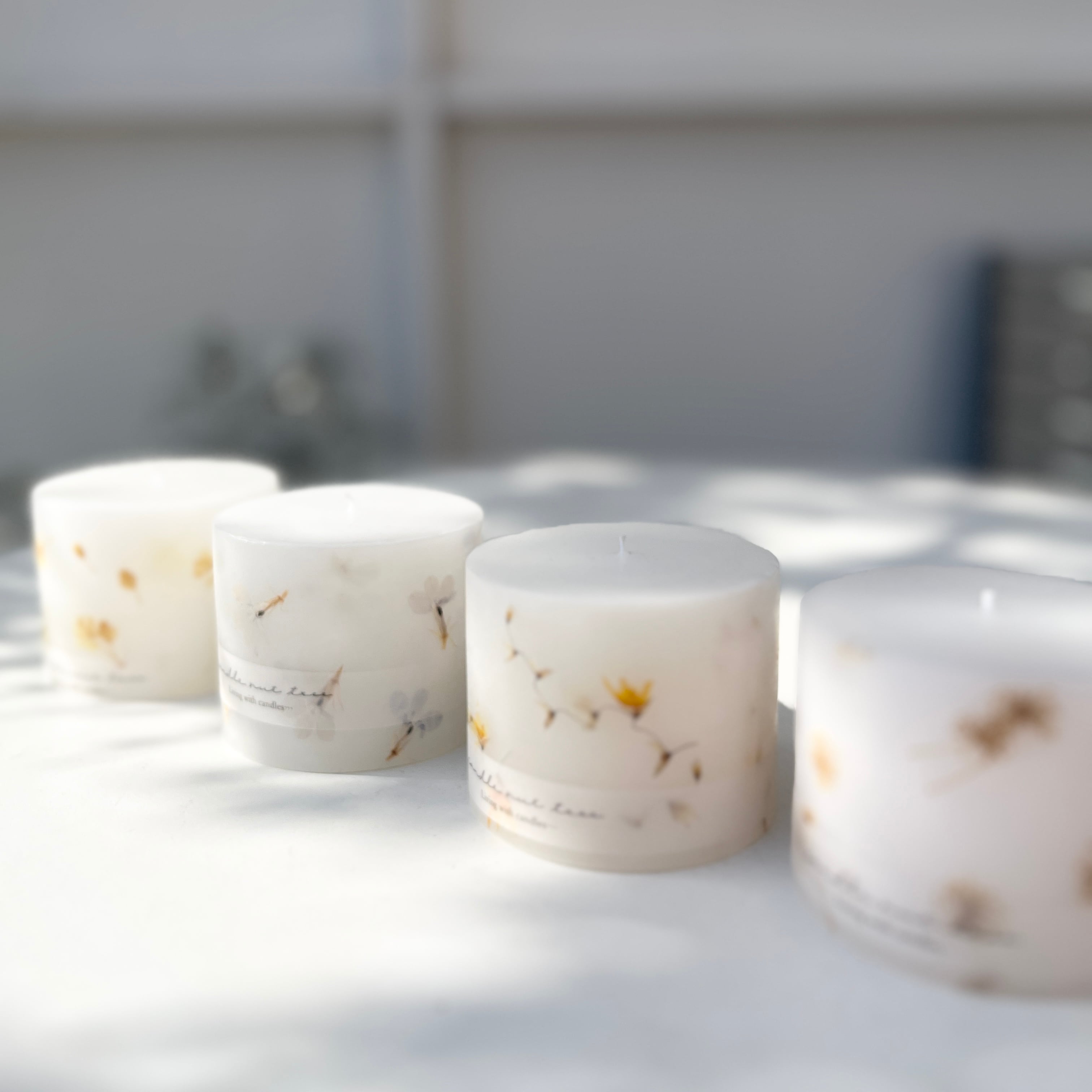 キャンドルの周りに押し花を散りばめたナチュラルな雰囲気が素敵なキャンドルです。