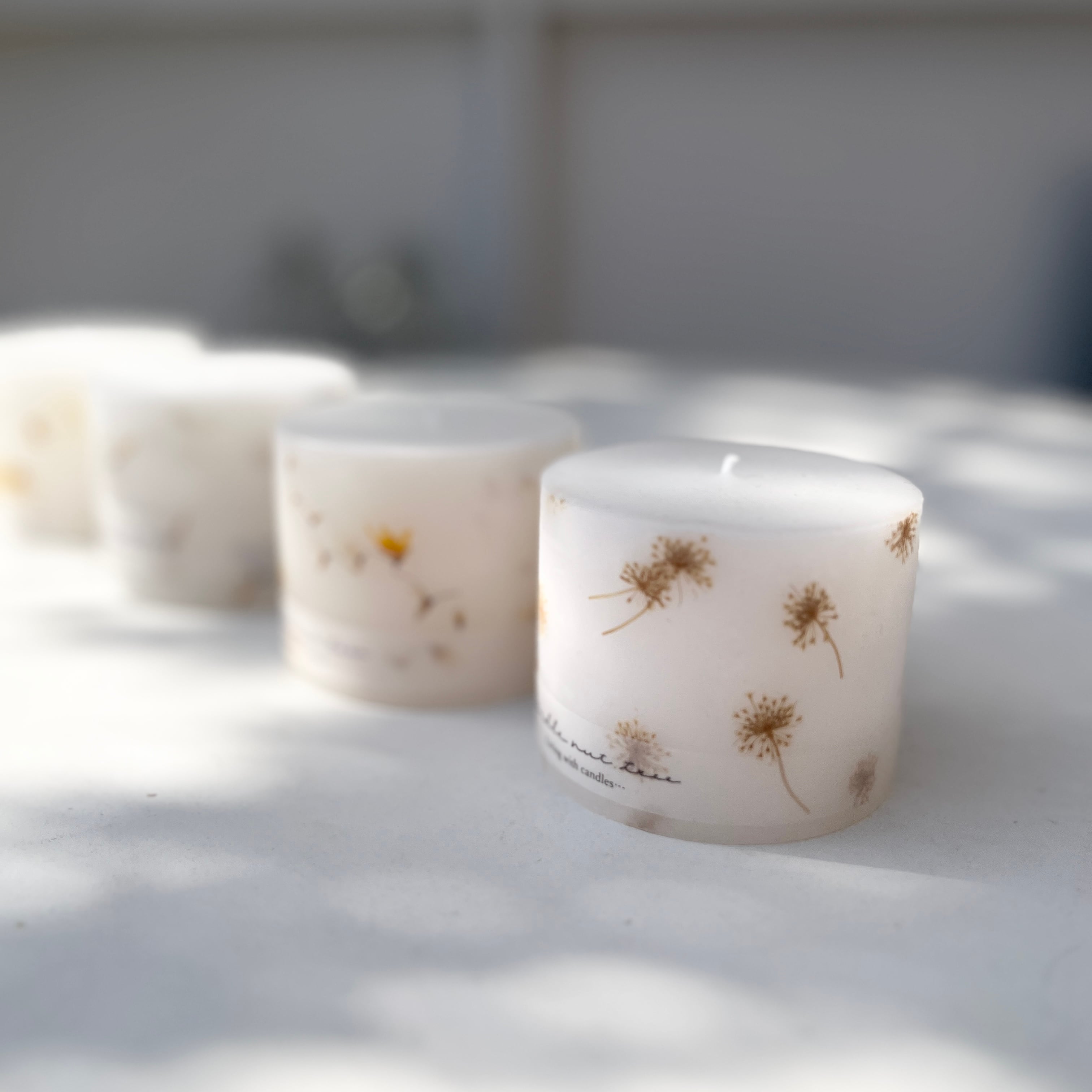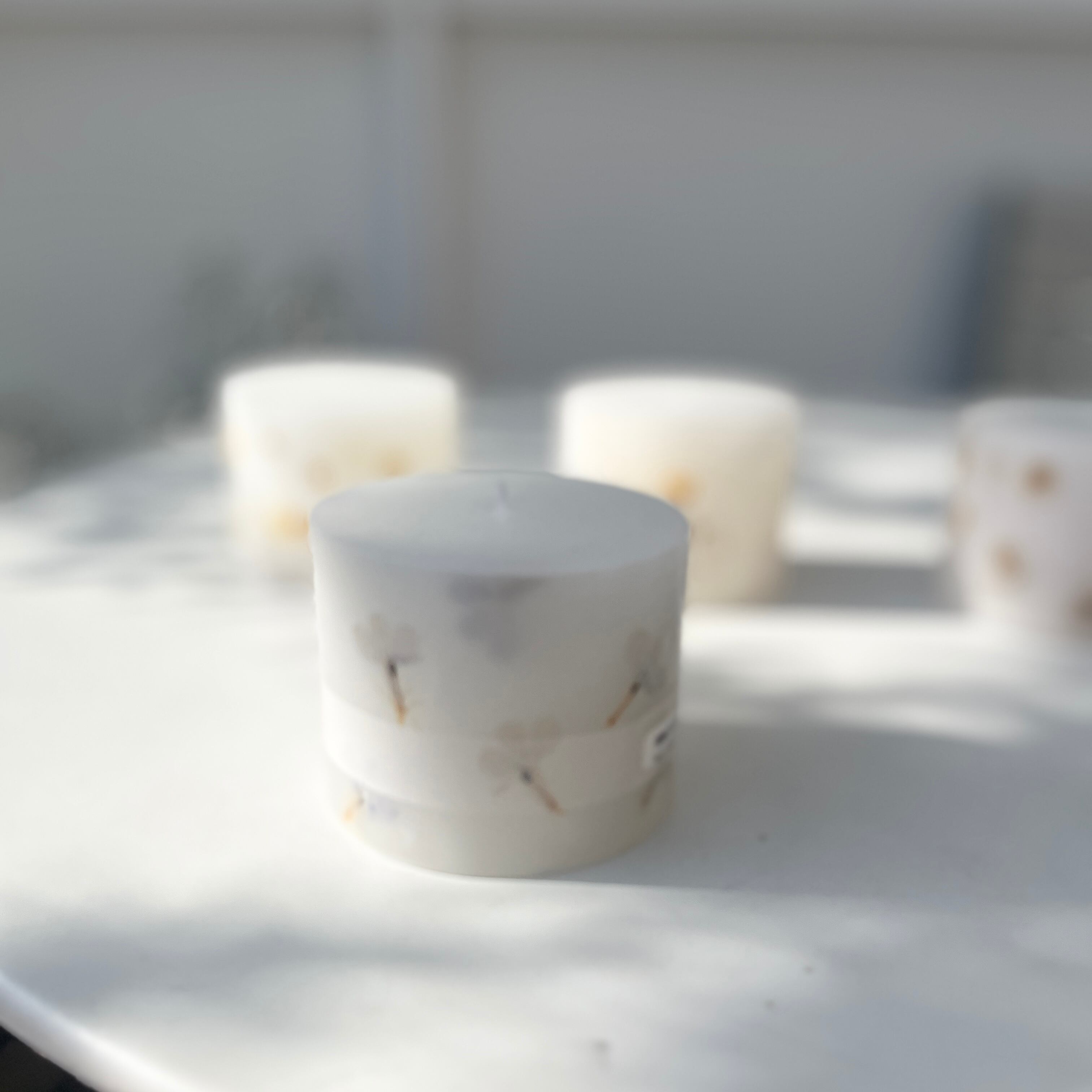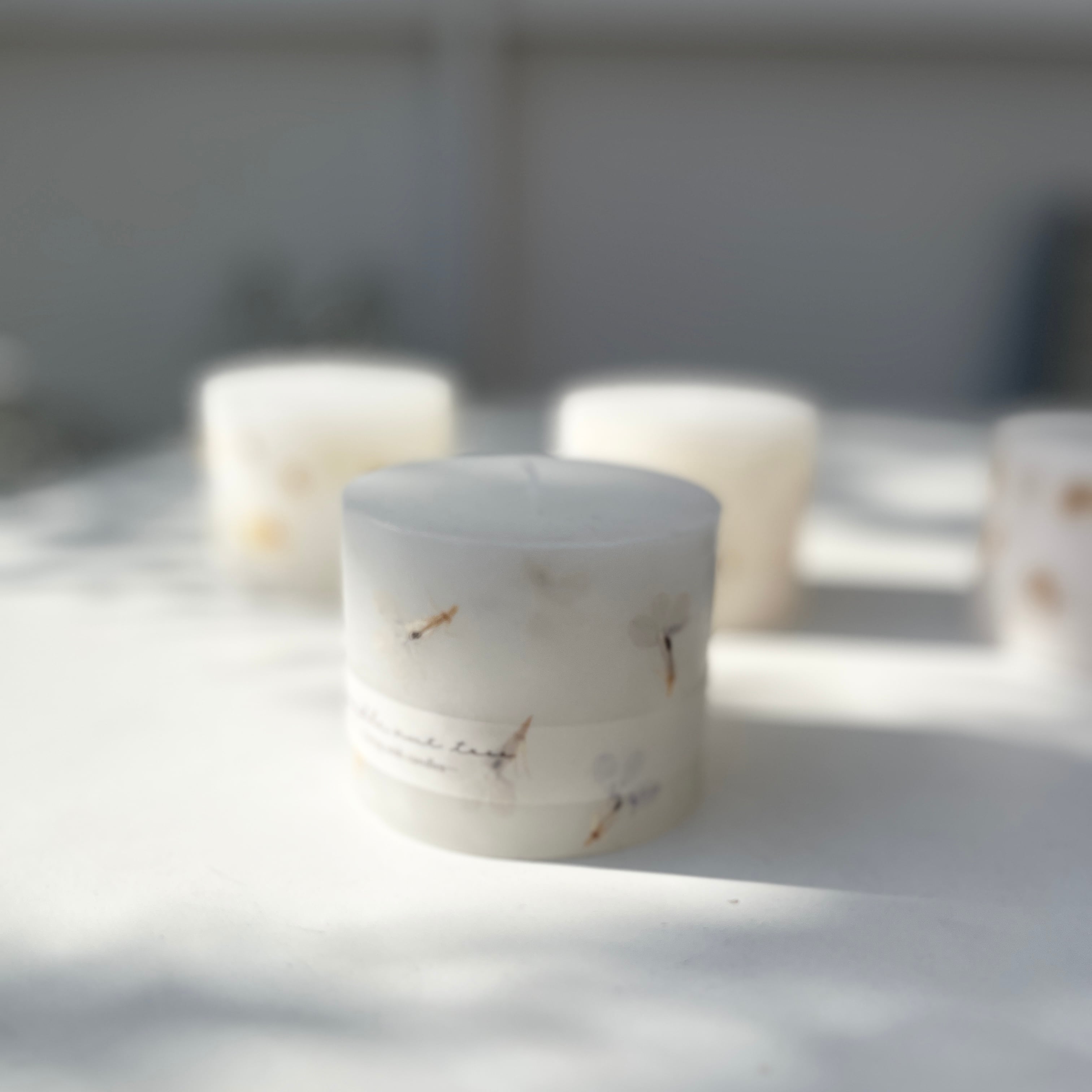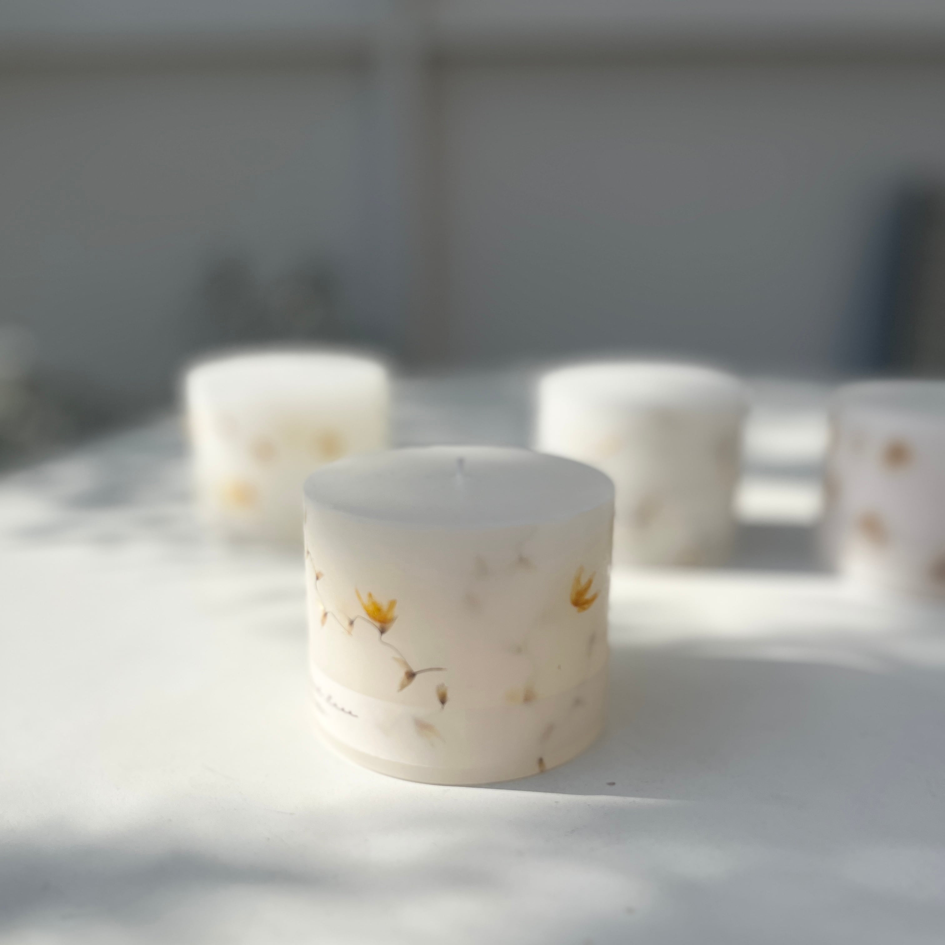 キャンドルの周りに押し花を散りばめたナチュラルな雰囲気が素敵なキャンドルです。