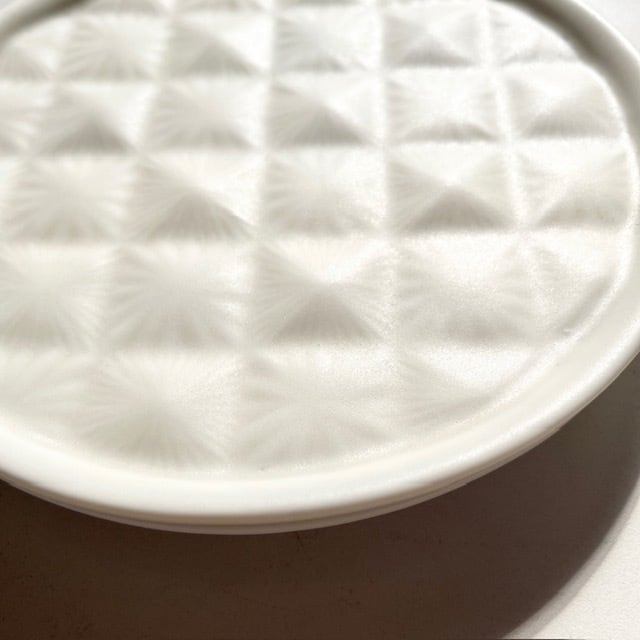 和模様にも、洋模様にも見える繰り返される美しい彫り模様が特徴の平皿です。