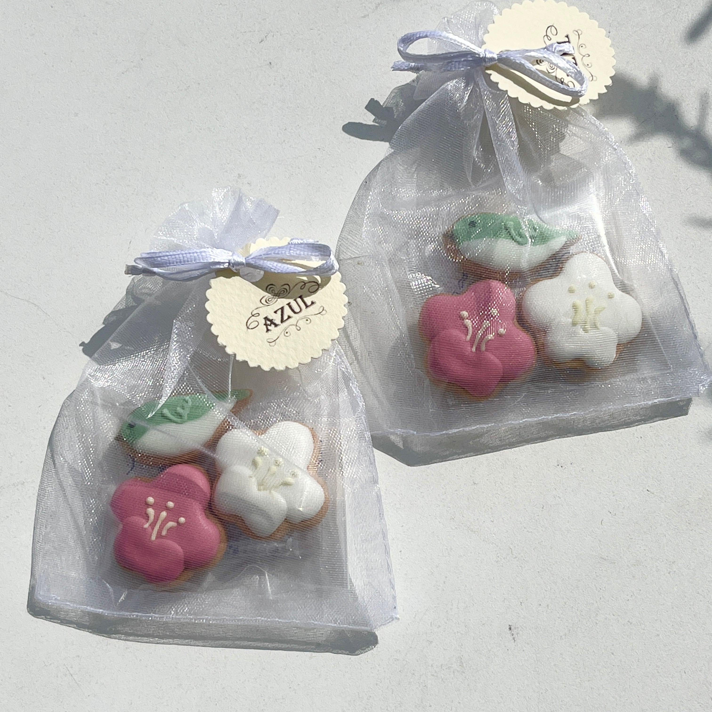 紅白の縁起の良い梅の花とうぐいすの形のかわいいクッキーが3個巾着に入っています。