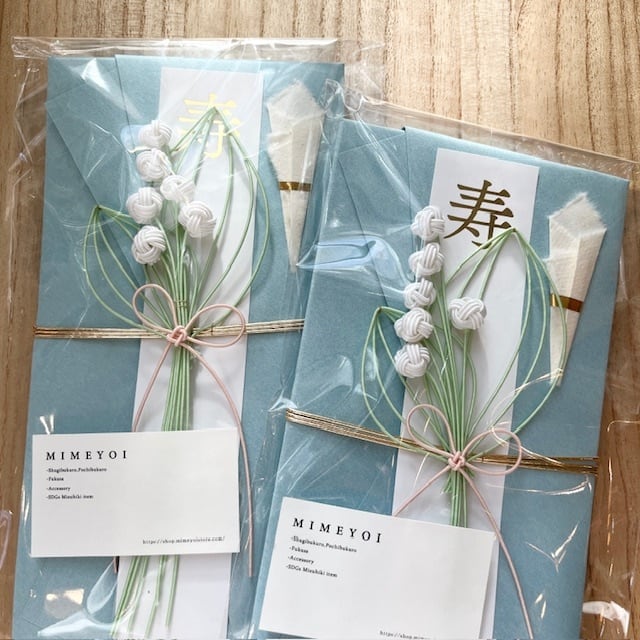 爽やかなあさぎ色の質感ある台紙に、丁寧に1つ1つ結んだ鈴蘭は絹巻水引を使い、高級感もありながら、可愛らしいカラーリングでシンプル、上品な祝儀袋です。