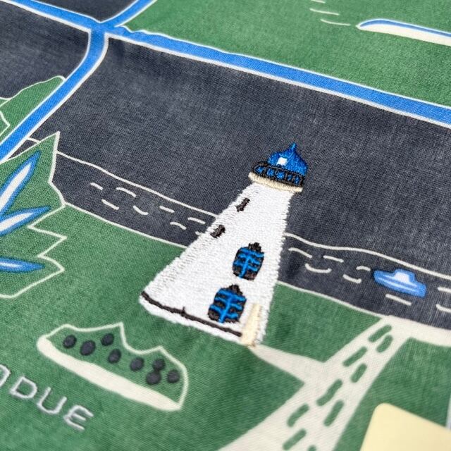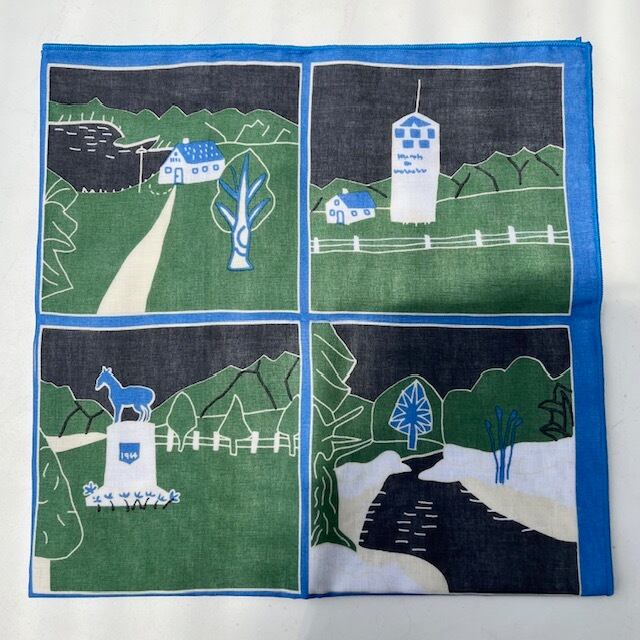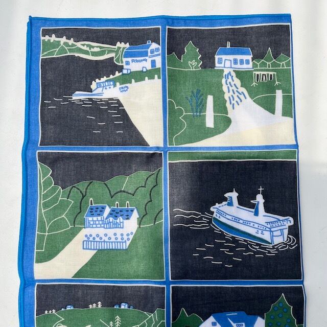 のどかな田舎の風景を切り取り、たくさんの景色が並んで1枚のハンカチに表現されています。