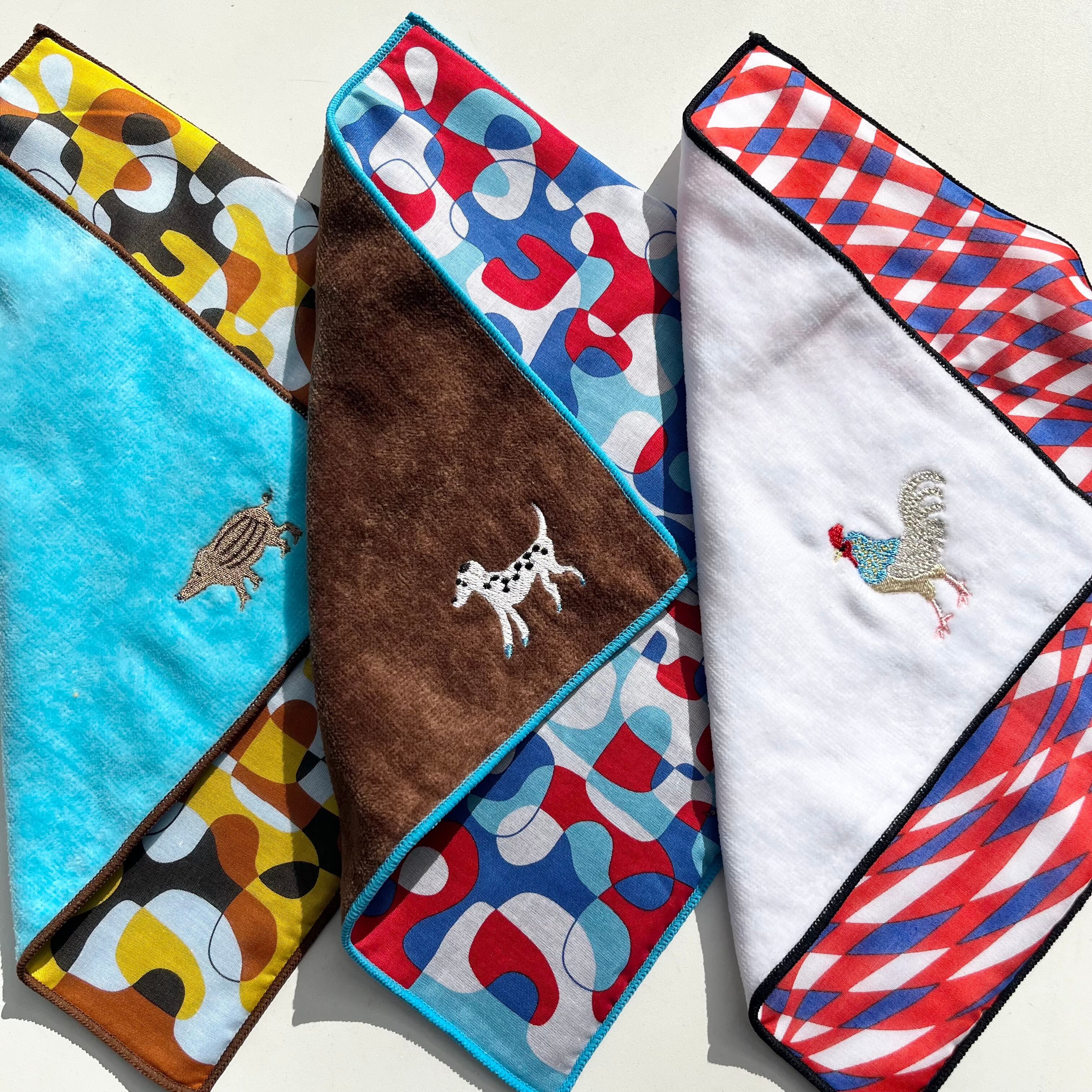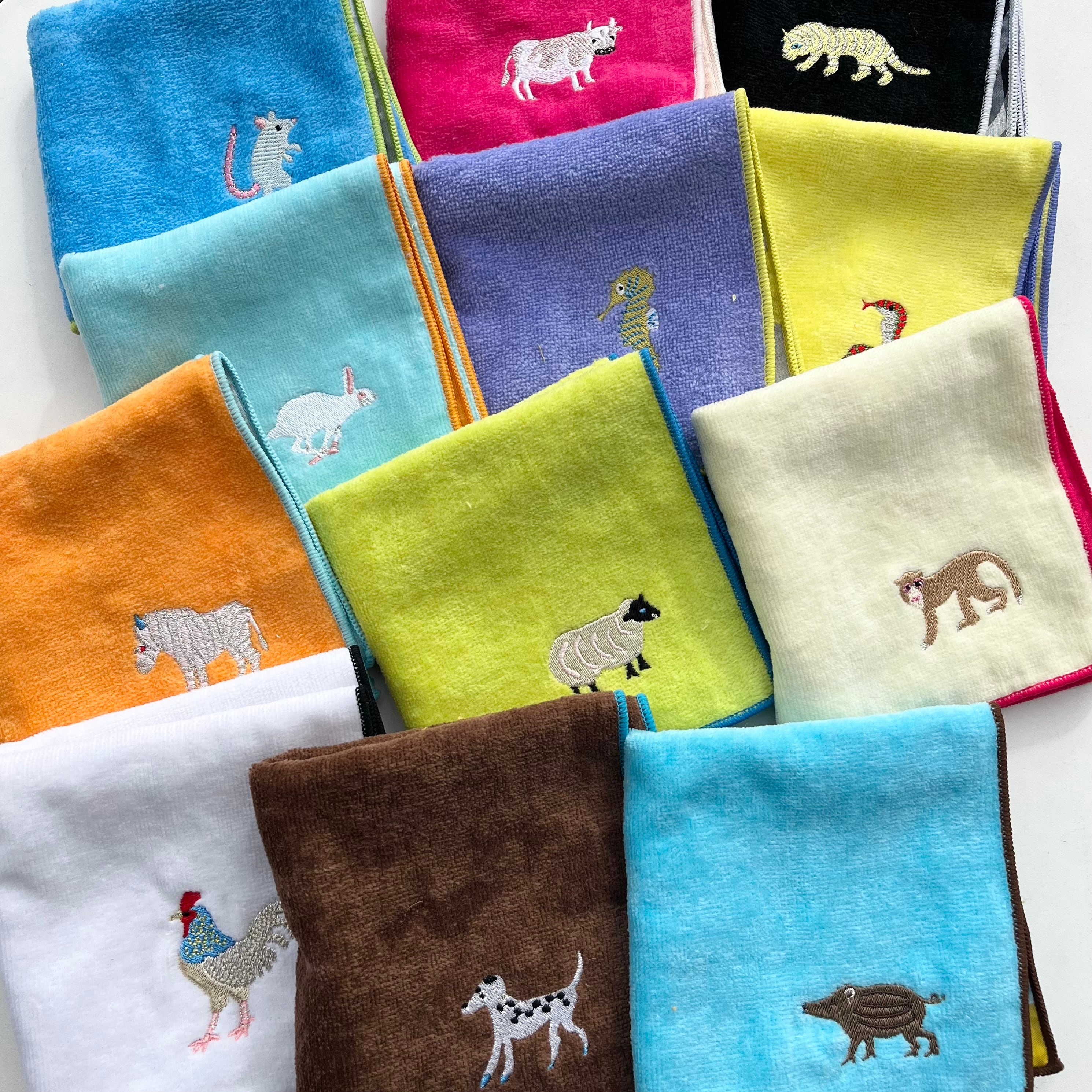 表裏の生地やデザインもすべて異なるこだわりのハンドタオルには、12種類のかわいい干支の刺繍がポイントです。