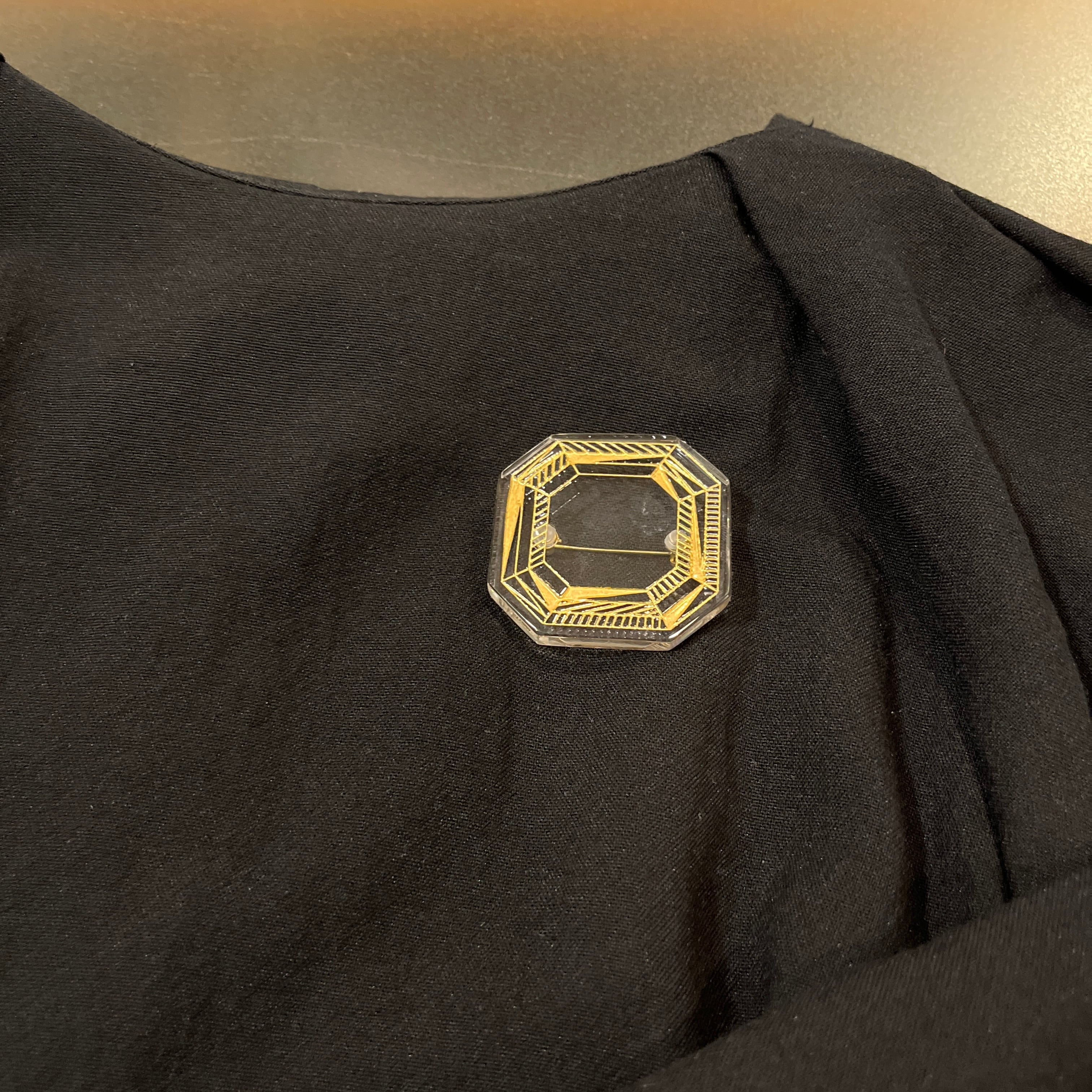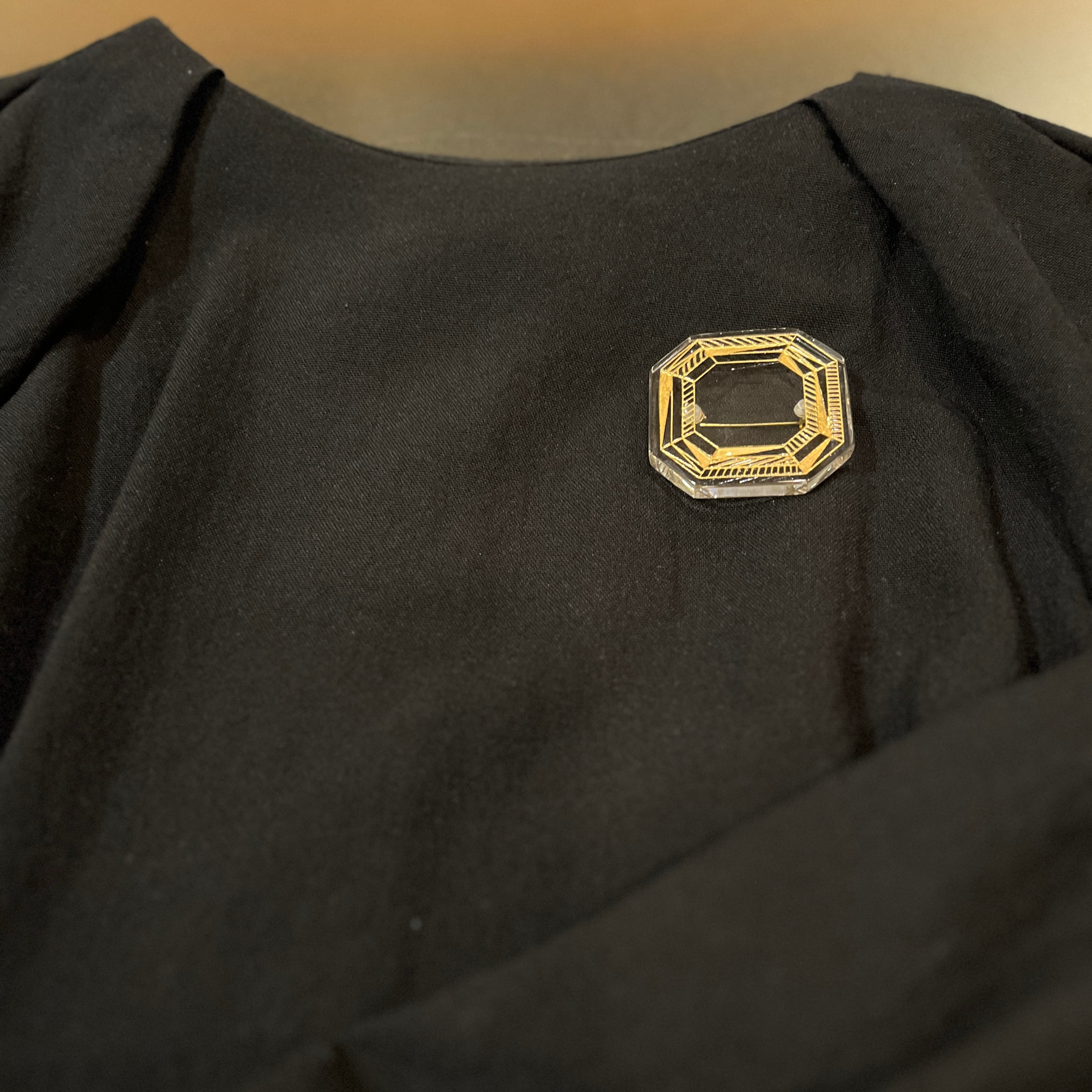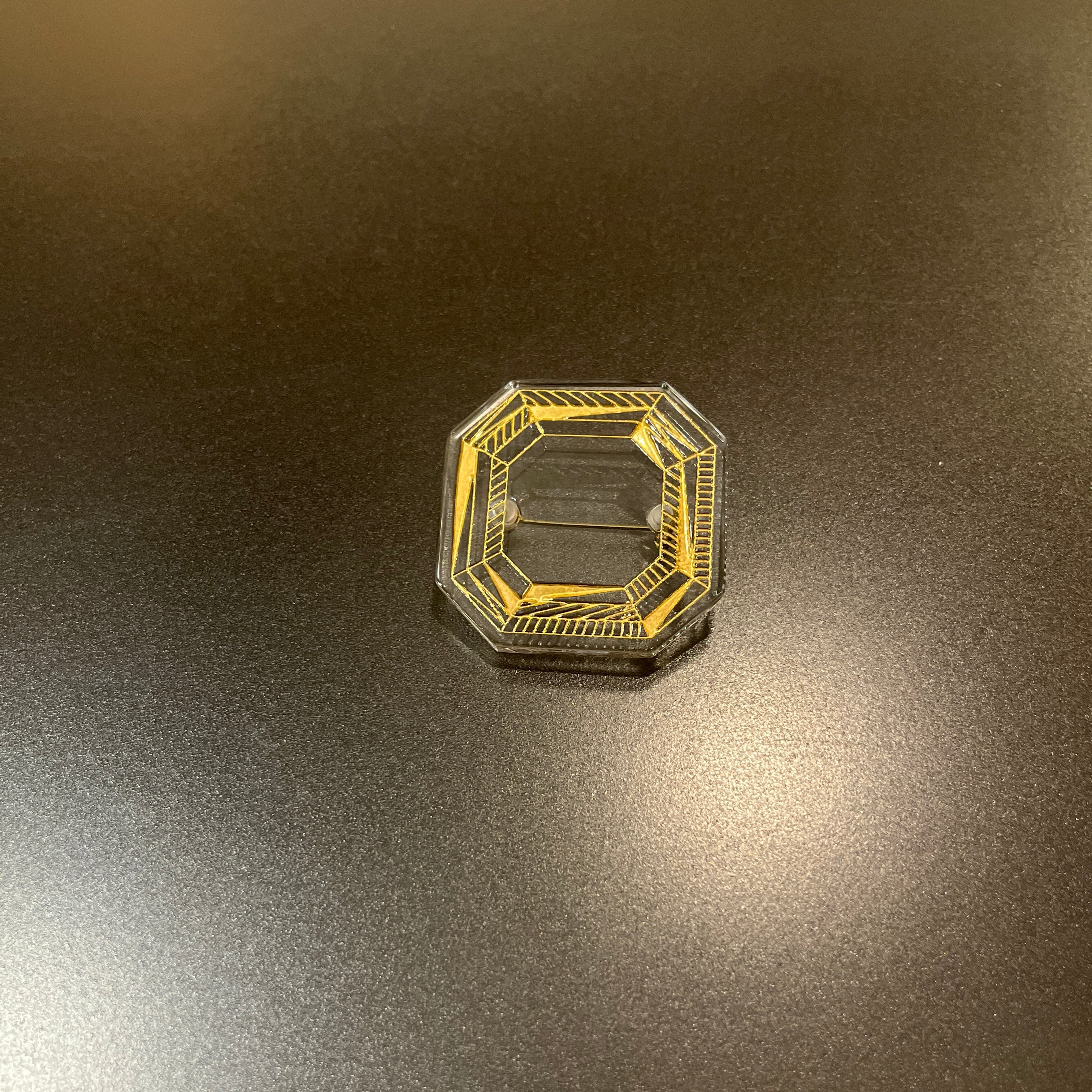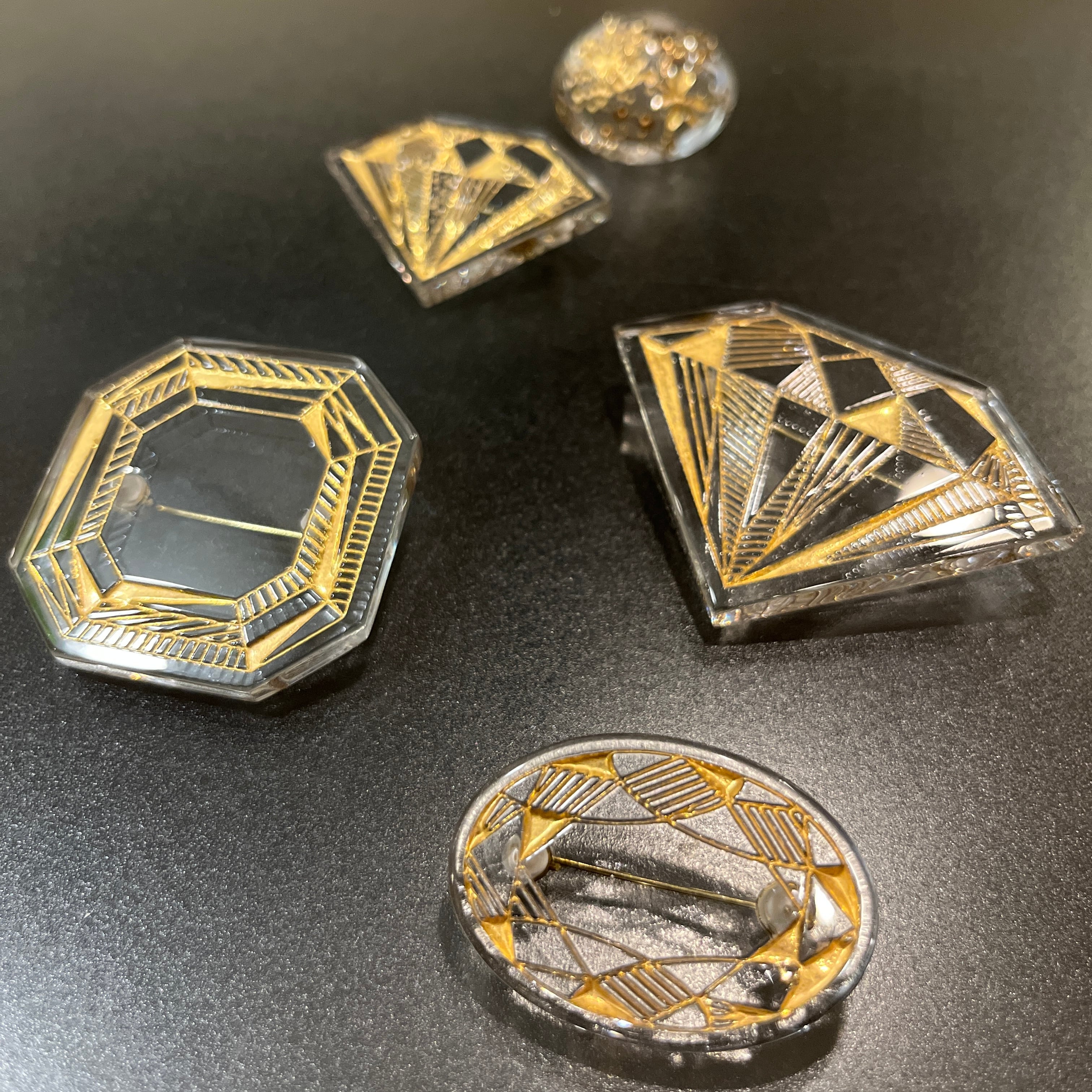 宝石の形にカットしたクリアのガラスに模様を彫り込み、金彩で金を焼き付けています。