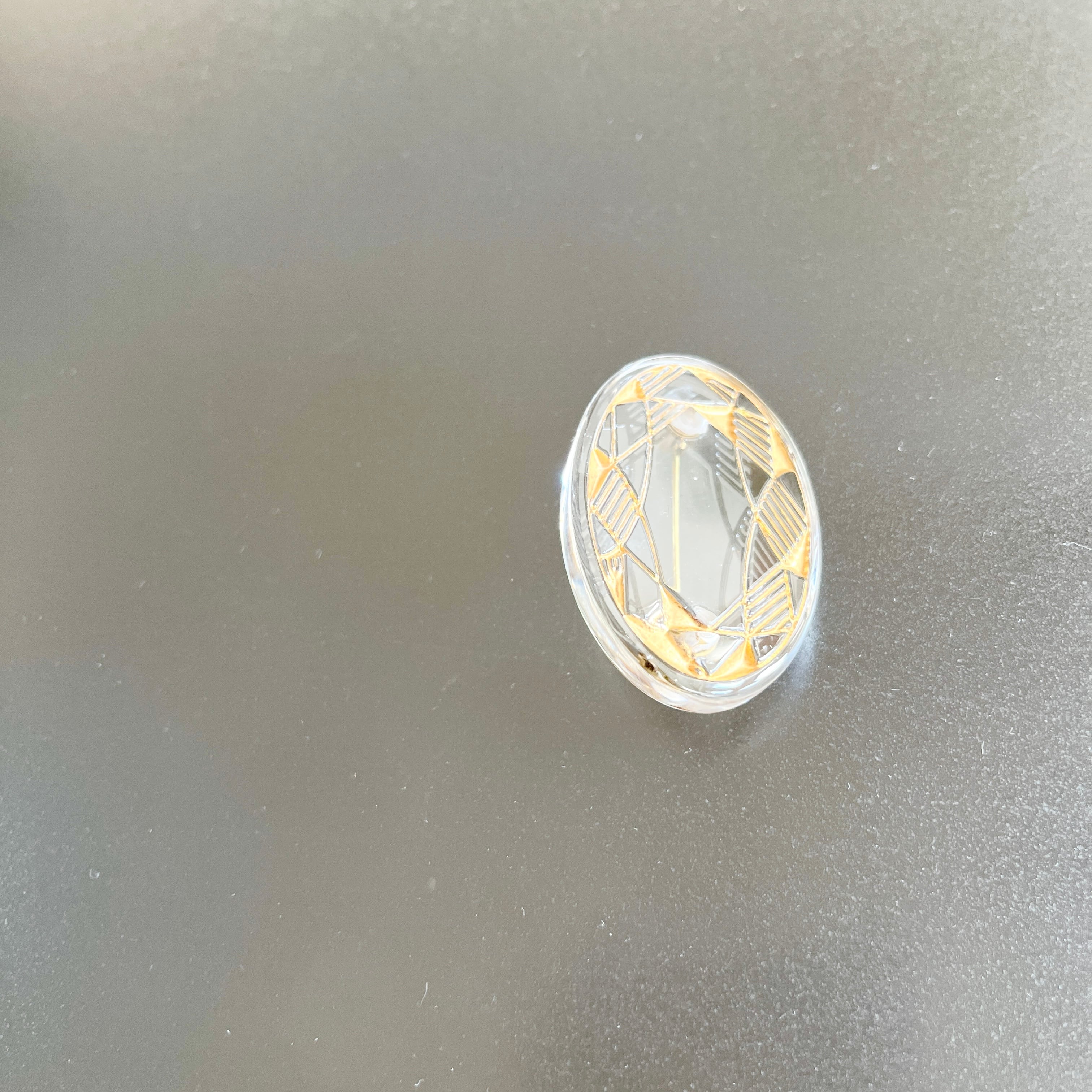 宝石の形にカットしたクリアのガラスに模様を彫り込み、金彩で金を焼き付けています。