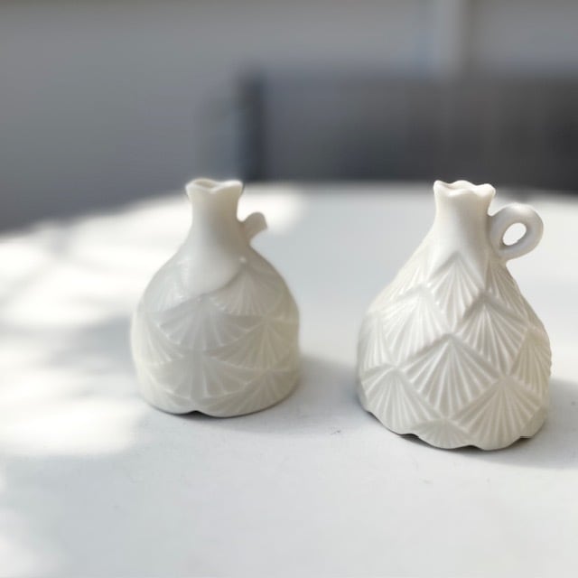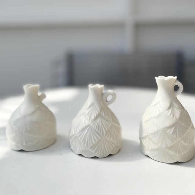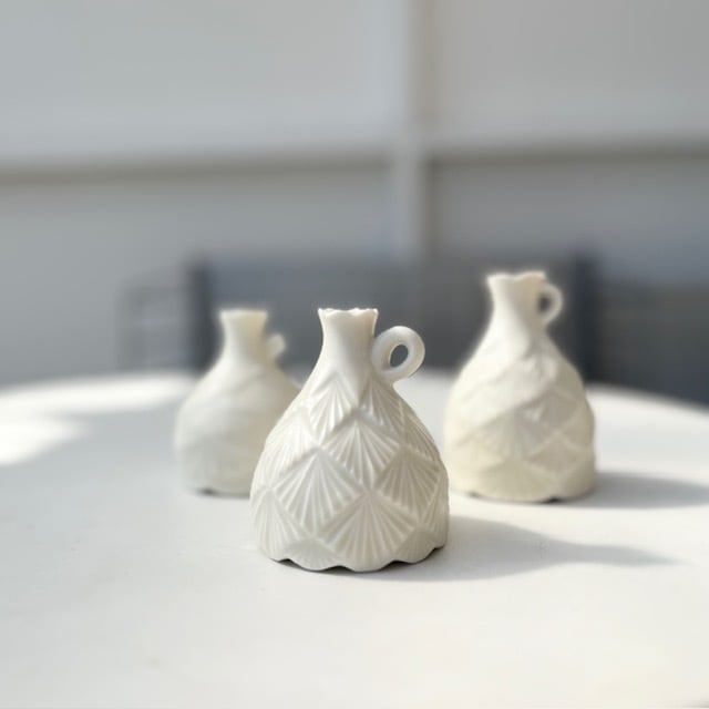 小さな取っ手と、美しい彫り模様が特徴の花器です。